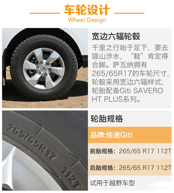 千里之行始于足下,要去跋山涉水,"鞋"肯定得合腳。薩瓦納擁有265/65R17的車輪尺寸,輪轂采用寬邊六輻樣式,輪胎配備Giti SAVERO HT PLUS系列。后保險杠設計稍顯保守,但也符合硬漢不飾粉墨的個性,四顆倒車雷達和倒車影像也是當今的必備裝備。只是倒車影像只出現在高配車型之中。