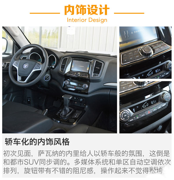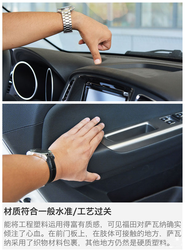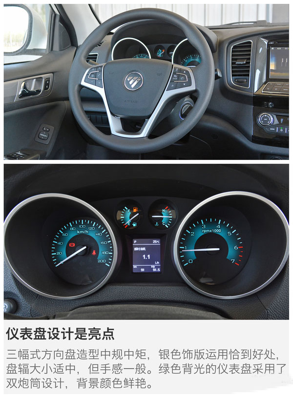 初次見面,薩瓦納的內里給人以轎車般的氛圍,這倒是和都市SUV同步調的。能將工程塑料運用得富有質感,可見福田對薩瓦納確實傾注了心血。三幅式方向盤造型中規中矩,銀色飾版運用恰到好處,盤輻大小適中,但手感一般。綠色背光的儀表盤采用了雙炮筒設計,背景顏色鮮艷,油表和水溫表被設計成2個小圓形,看著很別致。