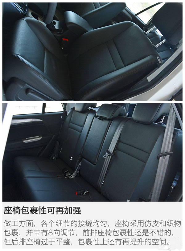 做工方面,各個細節的接縫均勻,座椅采用仿皮和織物包裹,并帶有8向調節,前排座椅包裹性還是不錯的,但后排座椅過于平整,包裹性上還有再提升的空間。