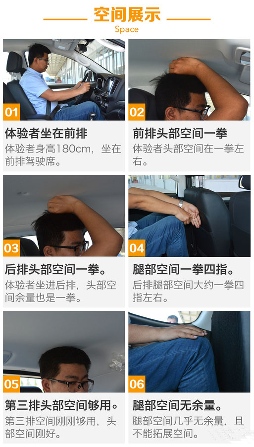 擁有2790mm軸距的薩瓦納采用2+3+2的七座布局,身高180cm的體驗者坐在前排頭部空間約一拳左右。保持坐姿后進入第二排,頭部空間與前排一致,腿部空間為一拳四指。坐進第三排,空間剛好可容納體驗者,頭部和腿部均沒有余量。