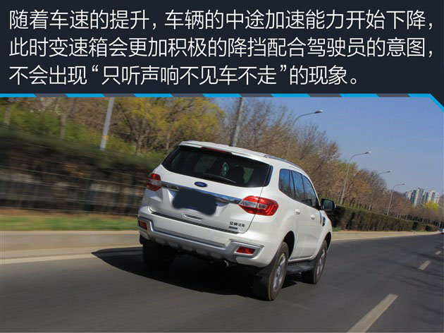 除了非鋪裝路面之外,撼路者在大部分時間里都在城市中行走,相比于普拉多2.7L或是帕杰羅3.0L車型孱弱的動力表現,撼路者搭載的2.0L EcoBoost渦輪增壓發動機有著180kW的最大功率,峰值扭矩也達到360Nm,傳動部分則是一臺六速手自一體變速箱,無論是硬件規格還是動力參數都要好于競爭對手。