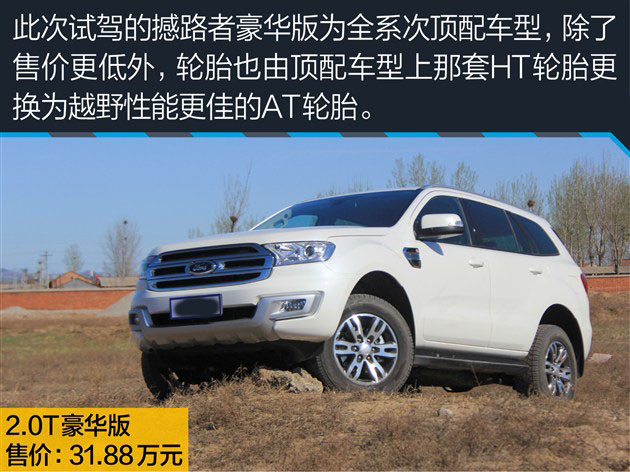 下面出場的這位相信大家都不會陌生,來自江鈴福特的撼路者,早前我們曾對撼路者2.0T旗艦型進行過詳細的測試,而這一次我們拿到了售價31.88萬元的豪華版車型(次頂配)。除了售價、配置有較大的差別外,豪華版配備的倍耐力Scorpion ATR輪胎比頂配車型上那套HT輪胎有著更加出色的越野性能,究竟換胎能否帶來脫胎換骨的效果?