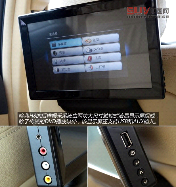 說完了前排我們再來聊一聊哈弗H8的后排娛樂系統,為了更好地與同級別車型競爭,哈弗H8為后排乘客提供了兩塊大尺寸觸控式液晶顯示屏。該顯示屏除了可以播放前排放入的DVD光盤,還可以讀取位于屏幕兩側的USB與AUX接口輸入的信號,當使用USB或AUX接口時,后排的兩塊顯示屏能夠實現獨立播放,互不干擾。