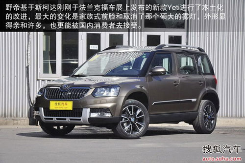 野帝基于斯柯達剛剛于法蘭克福車展上發布的新款Yeti進行了本土化的改進,最大的變化是家族式前臉和取消了那個碩大的霧燈,外形顯得親和許多,也更能被國內消費者去接受。