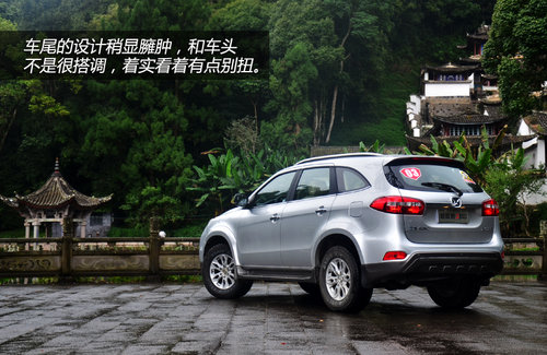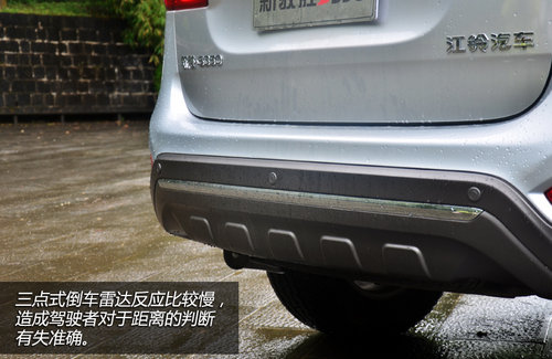 車尾的造型比較臃腫,相比車頭來說,造型并不是很美觀,尾燈的輪廓沒有什么美感可言,輪廓顯得比較生硬。車尾下包圍外觀設計的不算太成熟,馭勝使用了三點式倒車雷達,在實際的體驗中,探頭反應速度稍有些滯后,給駕駛者的觀察帶來一定的不便,不能及時的估計車尾與障礙物的距離。