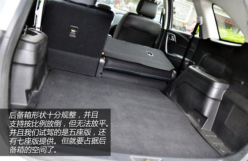 后排中央扶手上沒有水杯架的設計,并且在后排的其它位置也找不到放置水杯的地方。后排座椅可四六比例放倒,后備箱內部比較規整,但后排座椅放倒后,并不能放平。稍稍有礙實用性。