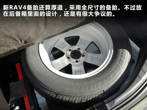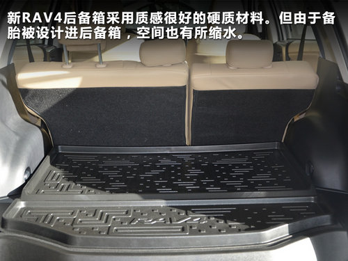 新RAV4后備箱采用質(zhì)感很好的硬質(zhì)材料。備胎如轎車一樣,設(shè)計(jì)在后備箱車內(nèi),采用全尺寸備胎。但由于備胎被設(shè)計(jì)進(jìn)后備箱,空間也有所縮水。在座椅完全放倒時(shí),后備箱最大可擴(kuò)展空間為1142L。