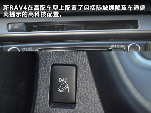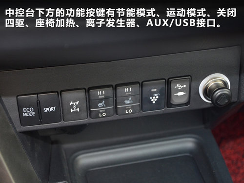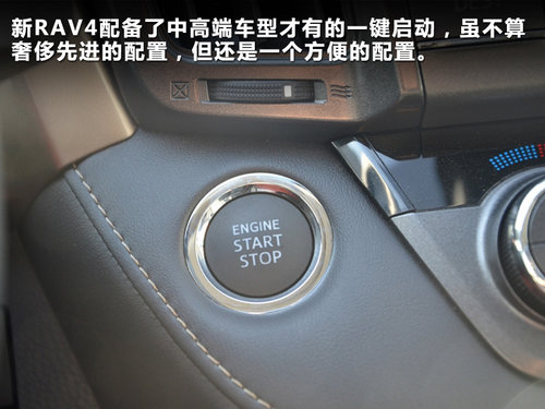 新加入的多種模式按鍵包括一鍵啟動(dòng)、節(jié)能模式、運(yùn)動(dòng)模式、關(guān)閉四驅(qū)、座椅加熱、離子發(fā)生器、音頻輸入接口及陡坡緩降。增加了全新RAV4的科技性和駕駛娛樂性。