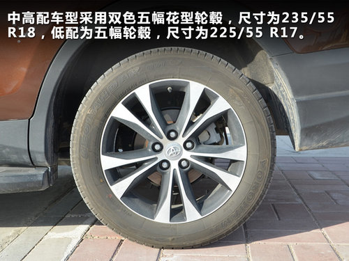 新RAV4中高配車型采用了雙色五幅花型輪轂,輪胎尺寸為235/55 R18,低配為普通五幅輪轂,尺寸為225/55 R17。