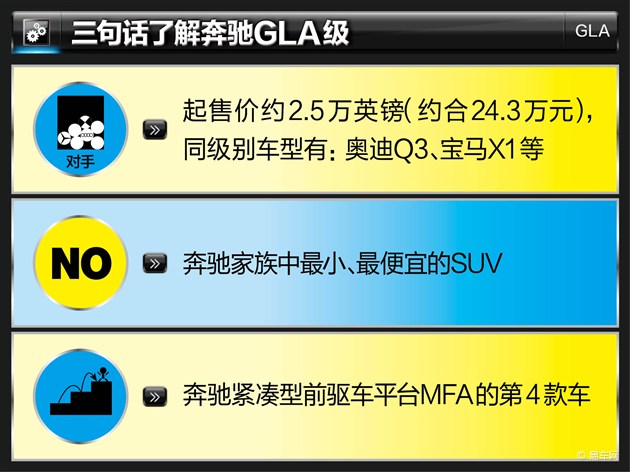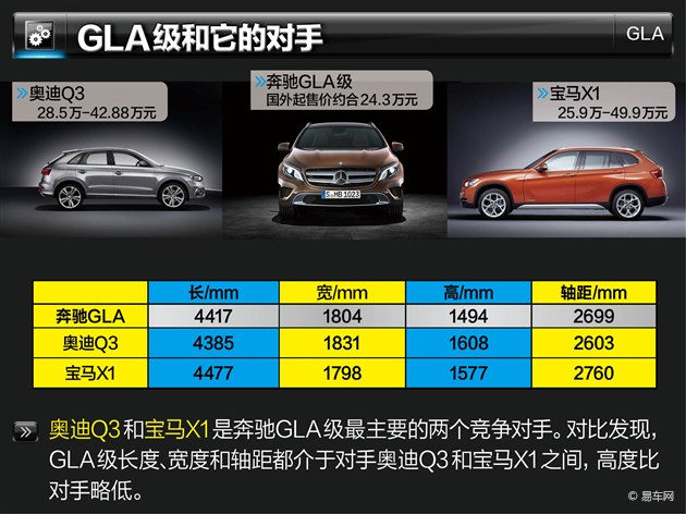 奔馳GLA級是奔馳首款緊湊級SUV車型,它將率先在英國上市,起售價約為2.5萬英鎊(約合人民幣24.3萬元)。該車還會在明年由北京奔馳引進(jìn)國產(chǎn),并將出席今年11月22日開幕的廣州車展。與它的競爭對手奧迪Q3和寶馬X1相比,它有哪些獨到之處?我們特意從外媒的GLA級最終測試報道中給您找出了答案。