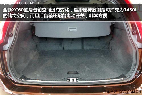 全新XC60的后備箱空間沒有變化,后排座椅放倒后可擴充為1450L的儲物空間,而且后備箱還配備電動開關(guān),非常方便。
