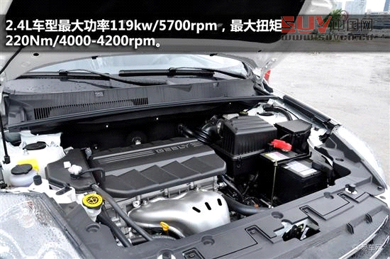 英倫SX7搭載的動力總成,分別為1.8L、2.0L和2.4L三種動力,1.8L發動機最大功率102KW/6200rpm,峰值扭矩172Nm/4200rpm;2.0L車型最大功率104KW/6000rpm,峰值扭矩178Nm/4000-4500rpm;2.4L車型最大功率119KW/5700rpm,最大扭矩220Nm/4000-4200rpm。1.8L和2.0L車型的傳動系統搭配5速手動變速箱,2.4L車型搭配6速手自一體變速箱。