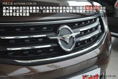進氣隔柵的造型保留著海馬汽車獨特的家族風格,分段式鍍鉻裝飾條使整體看上去更加富有層次,以黑色為主要色調的前格柵更顯運動,整體風格非常富有質感。
