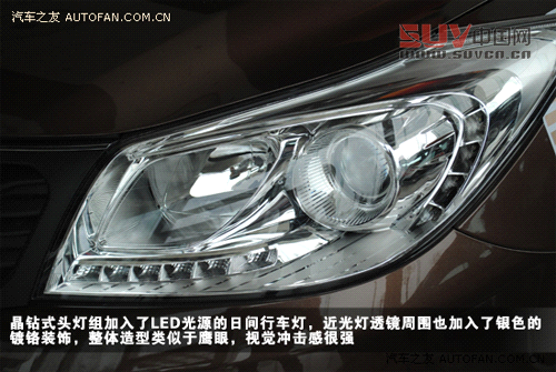 晶鉆式頭燈組加入了LED光源的日間行車燈,近光燈透鏡周圍也加入了銀色的鍍鉻裝飾,整體造型類似于鷹眼,視覺沖擊感很強。