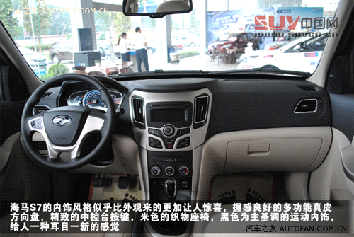 _ueditor_page_break_tag_海馬S7的內飾風格似乎比外觀來的更加讓人驚喜,握感良好的多功能真皮方向盤,精致的中控臺按鍵,米色的織物座椅,黑色為主基調的運動內飾,給人一種耳目一新的感覺。
