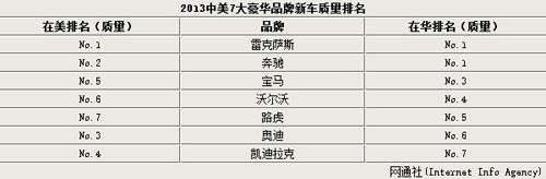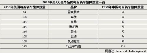 當今消費者在購車時不僅追求車輛的美觀性、舒適性以及科技性,同時更看重汽車的品質及安全性。網通社從2013年中、美新車質量排行榜中挑選出7大主流豪華品牌,并將這些品牌進行匯總排名,通過對比可以發現:7個豪華品牌在中國及美國市場的新車每百輛車的故障數量有著巨大差異。如雷克薩斯與奔馳品牌,在華及美國市場的表現均較優異;而寶馬、沃爾沃、路虎等品牌在中美市場的排名則大相徑庭。(數據來源J.D.Power 2013年中國、美國新車質量IQS報告)