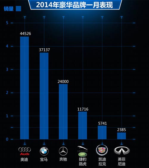 從以上圖我們不難看出,奧迪、寶馬、奔馳在華銷(xiāo)量榜單上榮獲前三甲,排名與2013年全年在華總銷(xiāo)量不盡相同。其中寶馬品牌在加大力度縮小與奧迪的差距,依托旗下熱門(mén)車(chē)型寶馬3系、5系取得了3.7萬(wàn)輛的成績(jī);奔馳在去年投放多款新車(chē)型的基礎(chǔ)上,實(shí)現(xiàn)銷(xiāo)量2.4萬(wàn)輛,而今年其還將投放多款新車(chē)型,屆時(shí)將縮小與奧迪、寶馬的差距。豪華品牌第二陣營(yíng)的捷豹路虎、凱迪拉克、英菲尼迪在華銷(xiāo)量上均增長(zhǎng)明顯,上述三大品牌也將在今年陸續(xù)引入多款新車(chē)型,屆時(shí)在銷(xiāo)量上將進(jìn)一步提升。