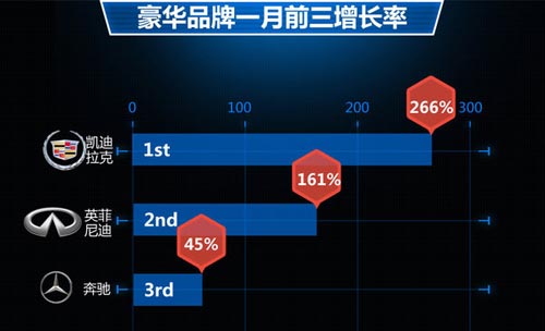 馬年伊始,各個(gè)豪華品牌在銷(xiāo)量上相比去年均有所提升,其中凱迪拉克依托旗下熱門(mén)車(chē)型ATS、XTS、SRX車(chē)型實(shí)現(xiàn)銷(xiāo)量5,471輛,較去年1,570輛,同比增長(zhǎng)高達(dá)266%,在榜單中獲得冠軍頭銜;而英菲尼迪則依托爸爸去哪等品牌宣傳活動(dòng)實(shí)現(xiàn)銷(xiāo)量2,385輛,較去年同比增長(zhǎng)161%;奔馳品牌也在華加大產(chǎn)品投放力度,其同比增長(zhǎng)45%的成績(jī)?cè)诳s小與奧迪、寶馬的差距。