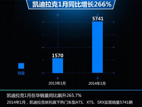 凱迪拉克1月在華銷(xiāo)量為5,741輛,與去年同期1,570輛相比同比飆升265.7%。其中,SRX 銷(xiāo)量從1,434輛同比勁增96.1%至2812輛;XTS在其上市以來(lái)的首個(gè)1月售出了2365輛,而ATS在1月在銷(xiāo)量上近500輛,上述三款車(chē)型為凱迪拉克在馬年打下堅(jiān)實(shí)的基礎(chǔ)。