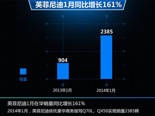 英菲尼迪1月份在中國(guó)市場(chǎng)的銷(xiāo)量達(dá)2,385臺(tái),同比增長(zhǎng)161%,一舉超越2013年月銷(xiāo)量記錄,延續(xù)了去年持續(xù)增長(zhǎng)的勢(shì)頭。其中表現(xiàn)最為搶眼的Q70L車(chē)型,同比增長(zhǎng)高達(dá)125%,而JX系列以及G系列車(chē)型均有著不錯(cuò)的市場(chǎng)表現(xiàn)。隨著英菲尼迪品牌戰(zhàn)略的發(fā)布,其將在華推出多款新車(chē)型,屆時(shí)在銷(xiāo)量上將進(jìn)一步提高,縮小與其他豪華品牌之間的差距。