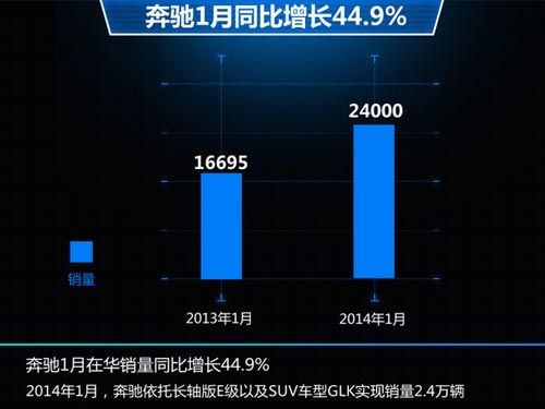 2014年,奔馳品牌銷(xiāo)量出現(xiàn)急劇增長(zhǎng),尤其是在中國(guó)市場(chǎng),其1月在華銷(xiāo)量達(dá)到了24,000輛,占到了全球25%的市場(chǎng)份額,相比去年16,695輛同比增長(zhǎng)44.9%,為2014年打下了堅(jiān)實(shí)的基礎(chǔ),同時(shí)將依托熱門(mén)車(chē)型奔馳E級(jí)、GLK以及即將推出的全新奔馳C級(jí)等車(chē)型縮小與奧迪、寶馬的差距。