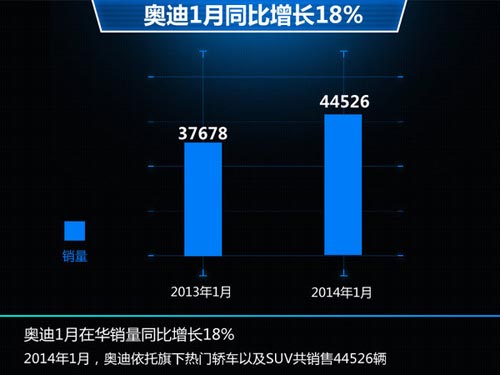 2014年1月份,奧迪在全球銷(xiāo)售124,850輛,同比增長(zhǎng)11.7%,而中國(guó)市場(chǎng)則占到了全球銷(xiāo)量的25%,共為中國(guó)消費(fèi)者提供44,526輛,同比增長(zhǎng)18.2%,其中奧迪Q3在1月共銷(xiāo)售6,000輛,增幅較為明顯;奧迪Q7在華銷(xiāo)量同比驟增75%。同時(shí)隨著奧迪在加速在華的產(chǎn)品投放力度,今年將陸續(xù)推出多款全新車(chē)型,其將在華進(jìn)一步擴(kuò)大與奔馳、寶馬的差距。