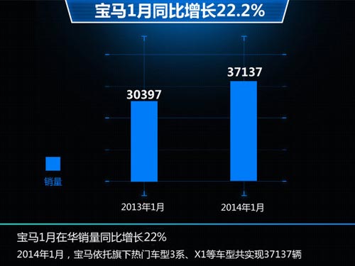 今年1月份,寶馬集團(tuán)依托旗下熱門(mén)車(chē)型3系、5系、X1等車(chē)型的強(qiáng)勁表現(xiàn),在華市場(chǎng)銷(xiāo)量達(dá)到37,137輛,較去年1月30,397輛的基礎(chǔ)上同比增長(zhǎng)22.2%,延續(xù)了去年的增長(zhǎng)勢(shì)頭,而隨著全新車(chē)型的引入,其將縮小與奧迪的差距。