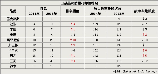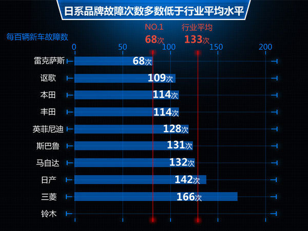 日系車型一直以來以油耗與舒適著稱,然而在汽車安全可靠性問題上也沒有絲毫懈怠,普通品牌如此,豪華品牌更是如此。據統計,2014年每百輛車故障的行業平均次數為133次,網通社查閱相關資料后發現:雷克薩斯、謳歌以及英菲尼迪三大日系豪華品牌,在質量可靠性方面均取得不錯的表現,其中雷克薩斯連續三年保持第一,而英菲尼迪和謳歌的排名也分別上升10位和4位。不過這日系三大豪華品牌全部躋身前十,但是他們之間的故障率差別也比較明顯,其中英菲尼迪與雷克薩斯相比故障率高出近1倍。