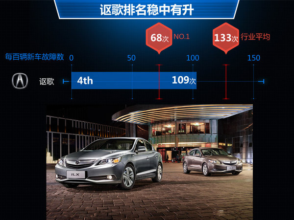 謳歌品牌憑借其SH-AWD智能四驅系統等先進技術,在質量可靠性方面表現十分穩定。在去年每百輛車出現故障次數為126次的行業平均水平中,謳歌以低于平均水平6次在全球品牌中位列第8;而今年故障次數下降11次,成功擠進前五,排名第四位,這在日系豪華品牌中,降幅是最大的。值得一提的是,其母品牌本田故障次數下降5次,由去年第7位上升到第6位,可見本田在質量可靠性中獨到的見解,這也對其市場表現起到直接影響作用。