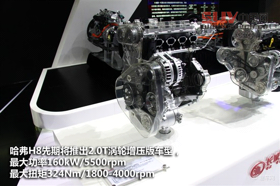 哈弗H8采用承載式車身結構,配合縱置四驅布置,搭載長城自主研發的2.0T缸內直噴發動機,最大功率160KW,最大扭矩為324Nm,匹配6速手自一體變速器,采用適時四驅系統,排放能夠達到歐5的排放標準。