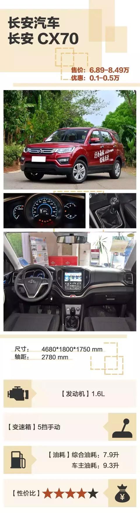 點評: 作為長安商用的首款SUV產品,長安CX70的車身高度相對較高,外觀方面簡單大氣,而且在安全配置上也很到位,盡管沒有全景影像,上坡輔助功能,半坡起步松開剎車有兩秒左右的駐車,夠時間讓慌張的新司機去踩油門起步。尤其在向右側轉彎或變道時盲區偏大,右側探頭的加入則能進一步降低右側盲區,除此之外還有前后雷達,車身穩定系統,主副座上的預警安全帶。頂配十萬不都不到卻有了這些配置,性價比可還行?