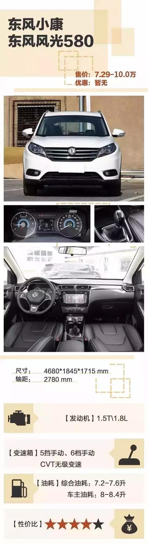 點評:不得不說東風風光和其他的微面專業戶有所不同,作為第一款SUV車型完全擺脫了微面的影子,外觀設計上反倒顯得有種成熟老道的SUV車型的感覺,車身比例也很協調。在配置上風光580還配備10英寸液晶屏、車載信息娛樂系統、電子手剎等空間方面,風光580提供五座和七座版可選,其中七座版采用了2+3+2的座椅布局,其中第二排可按60:40比例放倒,第三排則支持50:50比例放倒。性價比杠杠的!