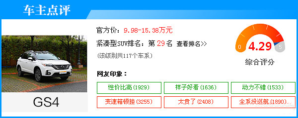 傳祺GS4的車主普遍表現為對愛車的設計非常滿意,而且對于傳祺的動力表現也能滿意。但諸如變速箱換擋頓挫感強是很多車主不滿的地方,另外也有部分車主對于傳祺GS4的售價表示偏高,且沒有配備定速巡航功能。