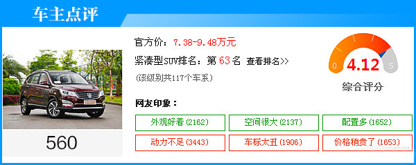 寶駿560的車主普遍認可愛車的外形設計,而且它的空間表現也比較滿意,另外就是配置方面很豐富。不過對于缺點,也有不少車主認為寶駿的車標不好看,而且動力表現不盡人意。