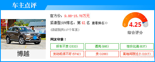 對于博越,車主比較看好的有點就是車型設計很漂亮,性價比高。但也有持不同意見的車主認為博越的售價比較貴,離地間隙過小,另外還有很大一部分車主認為博越的動力表現很糟糕。