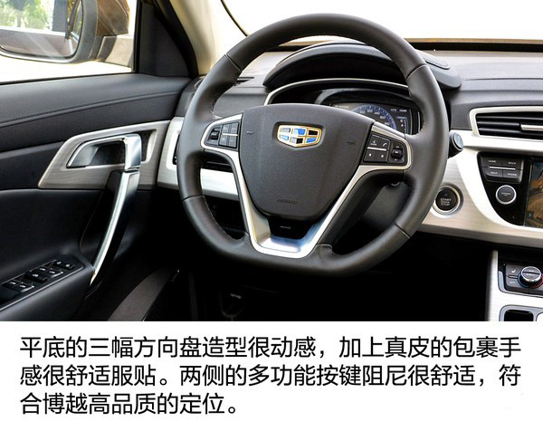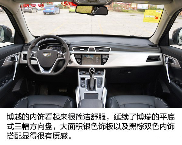博越的內飾看起來很簡潔舒服,延續了博瑞的平底式三幅方向盤以及大面積銀色飾板以及黑棕雙色內飾設計,但在中控布局上更強調SUV的動感特性,通過柔美的亮銀飾條,回紋細節裝飾加入了更多的中國風元素。