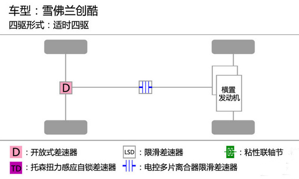 創(chuàng)酷采用了目前最常見(jiàn)的四驅(qū)結(jié)構(gòu),就是縱置發(fā)動(dòng)機(jī)將動(dòng)力輸出給變速箱,然后變速箱再傳遞給前后軸,其中傳遞到后軸之間有一個(gè)多片式離合器,電子系統(tǒng)會(huì)自動(dòng)按照不同路面分配動(dòng)力,最大可以時(shí)間100%前驅(qū)與50:50前后動(dòng)力分配。另外據(jù)官方數(shù)據(jù),前驅(qū)切換四驅(qū)的時(shí)間僅需要0.2秒。