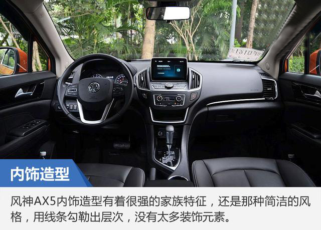 風神AX5內飾造型有著很強的家族特征,還是那種簡潔風格,用線條勾勒出層次,沒有太多裝飾元素。中控臺采用偏軟的搪塑,手感舒適,,接縫比較均勻,整體做工也非常不錯。三幅式方向盤采用真皮包裹,并且在三點和九點位設置貼合手型的凹槽,握感扎實。兩側的多功能鍵可以提供多媒體控制、藍牙電話和ACC巡航控制等功能。雙圓式表盤外圈采用鍍鉻包邊,黑底白字清晰易讀,也符合其定位。中央的彩色顯示屏,可以提供大量行車信息。中控臺頂部配置了一塊8英寸的顯示屏,屏幕的分辨率和反應速度都還不錯,下方配備了物理按鍵的控制區。多媒體系統配備了WindLink車載智能互聯系統,可以與安卓系統手機連接實現共享以及定位服務等功能。而且Telematics遠程技術信息服務支持離車導航,借助車機互聯功能將導航信息推送到用戶手機端。中高配車型配有360°全景影像,后方的輔助線可以可與方向盤隨動,使日常泊車安全性大幅度提升,如果攝像頭的清晰度能再高點就更好了。手動空調功能旋鈕與按鍵設計的整體布局都非常簡潔,并且使用起來的質感與阻尼感方面也有著不錯的表現,同時還配備了后排出風口。中控臺底部設置了USB、AUX、SD卡槽和12V電源接口,方便外部設備的接駁。四門都配有電動升降車窗,并且都具備一鍵升降功能。