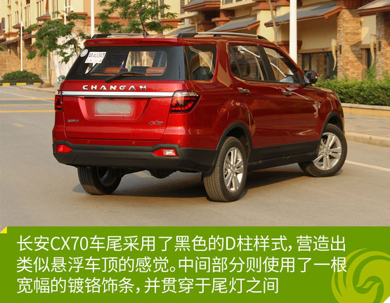 車尾部分,長安CX70采用了黑色的D柱樣式,營造出類似懸浮車頂的感覺。中間部分則使用了一根寬幅的鍍鉻飾條,并貫穿于尾燈之間。新車還設有銀色的行李架及擾流板。