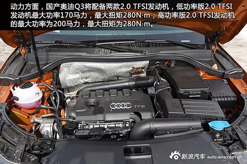 國產奧迪Q3仍舊搭載兩種不同功率的2.0TFSI發動機,其中低功率版發動機最大功率為170馬力(125千瓦)/4300-6200轉每分鐘,峰值扭矩為280牛米/1700-4200轉每分鐘。高功率版與進口車型在調校上略有不同,最大功率降至200馬力(147千瓦)/5000-6200轉每分鐘,最大扭矩則由300牛米降至280牛米/1800-4900轉每分鐘。此外,與發動機匹配的是7擋雙離合變速箱,為了適應發動機功率與扭矩上的變化,它在控制程序以及齒比方面進行了調整。