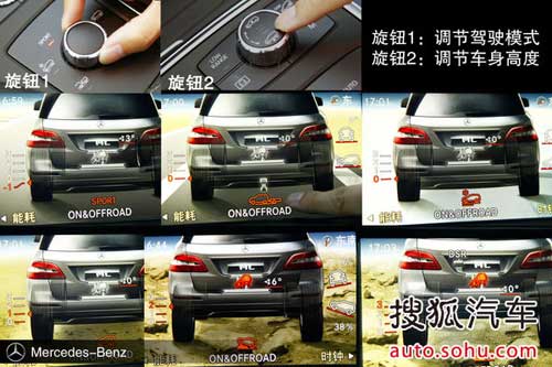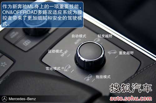 作為新奔馳ML身上的一項重要技能,ON&OFFROAD多路況適應(yīng)系統(tǒng)為操控者帶來了更加細(xì)膩和安全的駕駛模式。從設(shè)計方面來看,新奔馳ML不同操控模式的選擇方式與路虎覽勝有些相似,這套系統(tǒng)能夠提供包裹自動模式、運動模式、雪地模式、拖掛模式以及兩種程度越野模式在內(nèi)的六種選擇。當(dāng)選擇任何一種模式,系統(tǒng)都會對發(fā)動機、變速箱、AIRMATIC空氣懸掛、轉(zhuǎn)向系統(tǒng)以及牽引力控制系統(tǒng)進(jìn)行相應(yīng)調(diào)節(jié),另外中控屏幕和儀表盤行車電腦也會隨時向操控者顯示當(dāng)前狀態(tài)。