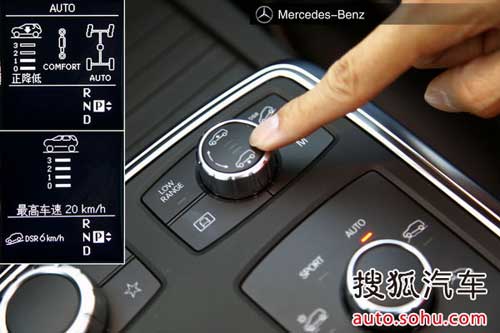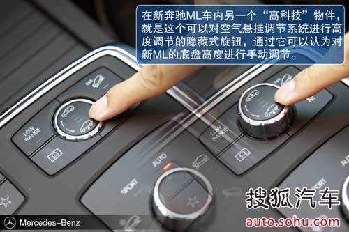 在新奔馳ML車內(nèi)另一個"高科技"物件,就是這個可以對空氣懸掛調(diào)節(jié)系統(tǒng)進(jìn)行高度調(diào)節(jié)的隱藏式旋鈕,通過它可以人為對新ML的底盤高度進(jìn)行手動調(diào)節(jié)。另外,在這個旋鈕的周圍還提供有低速四驅(qū)、陡坡緩降以及手動換擋模式等按鈕。
