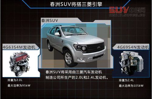 春洲SUV作為江蘇卡威集團推出的首款SUV,在車身尺寸方面屬于緊湊型SUV,其長寬高分別為4600mm、1855mm和1810mm,軸距為2730mm。在動力方面,新車將搭載由三菱汽車發動機制造公司所生產的4G63S4M和4G69S4N型號發動機,排量和最大功率分別為2.0L/95kW和2.4L/105kW。