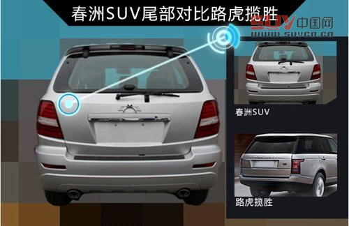 在外觀方面,春洲SUV各個細節都顯露出大氣和時尚,其中網狀進氣欄柵更是給車身添加了尊貴感。新車的前臉和路虎攬勝相似度非常高,并且在后視鏡下方采用了鯊魚腮構造。尾部方面,新車的尾燈輪廓也與前大燈相對應,尾部設計也和路虎攬勝有相似之處。