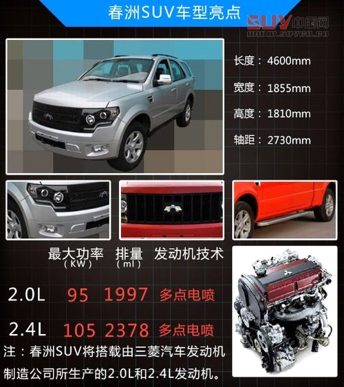 江蘇卡威集團作為一個制造各種車用部件、車身等大型綜合性企業集團,將推出旗下首款乘用車型,由于近年國內SUV市場的火熱,多家自主品牌都相繼進軍該細分市場,所以江蘇卡威將推出的第一款乘用車定為SUV車型,命名為春洲SUV。近日網通社了解到:春洲SUV將搭三菱2.0L和2.4L引擎,外形酷似路虎攬勝。