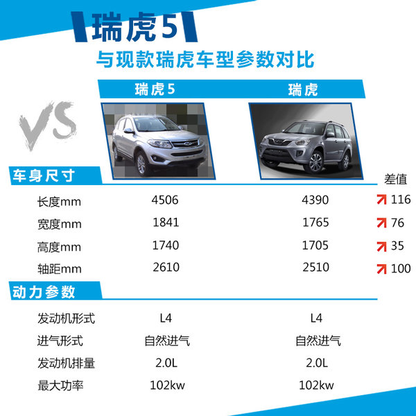 瑞虎5車型是奇瑞基于β5概念車打造而來的,其內(nèi)部代號為T21。從量產(chǎn)版車型的車身尺寸可以看出,瑞虎5的定位要高于瑞虎,達(dá)到了緊湊SUV的水平,該車或?qū){借2610mm的軸距以及1740mm的車身高度,使得乘坐者可以擁有較大的車內(nèi)空間,對于熱愛旅行、越野的消費(fèi)者或?qū)⑹莻€不錯的選擇。動力方面瑞虎5將繼續(xù)沿用瑞虎車型所使用的2.0L自然進(jìn)氣發(fā)動機(jī),最大功率102kw,與之匹配的則是5速手動和一代CVT變速器。