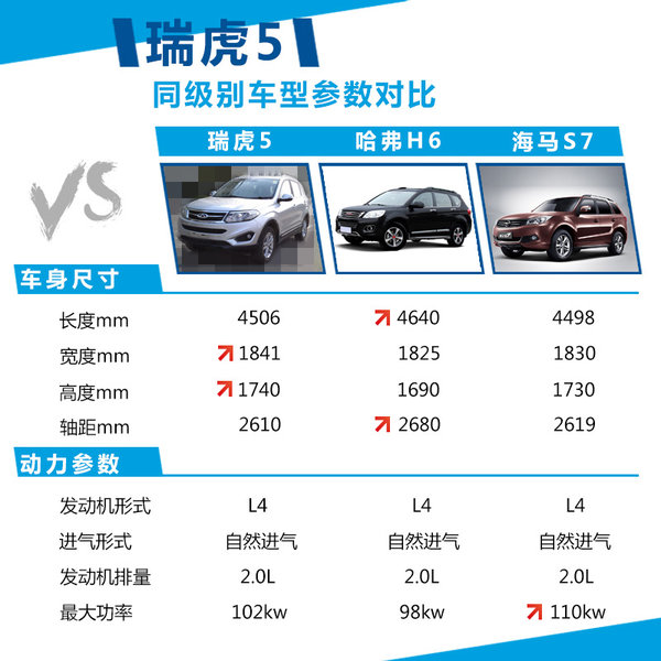 哈弗H6在推出后,其每月均保持著1.5萬的銷售業(yè)績,瑞虎5上市后,將競爭對手直接鎖定在了哈弗H6和海馬S7上。車身尺寸方面瑞虎5在寬度與高度上均超越了競爭對手,其搭載的2.0L引擎在參數(shù)上已經(jīng)超越了哈弗H6 2.0L發(fā)動機(jī),與海馬S7相比也毫不遜色。