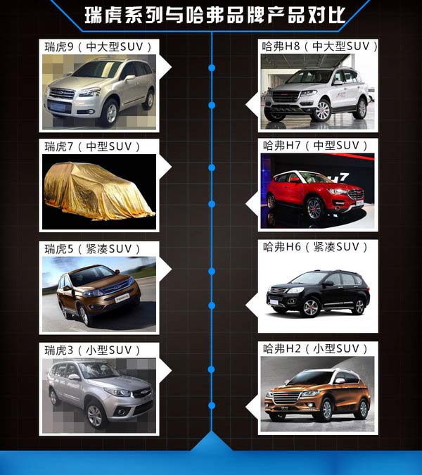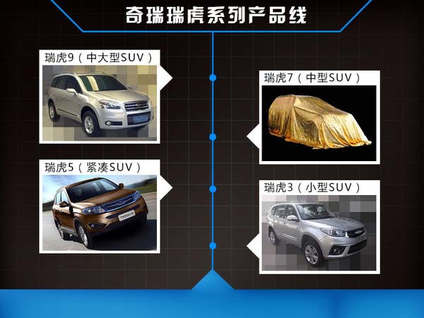 2013年10月30日,奇瑞旗下第二款SUV瑞虎5正式下線(xiàn),該車(chē)定位于緊湊SUV,未來(lái)奇瑞還將推出涉足更高領(lǐng)域的SUV車(chē)型來(lái)提升其品牌影響力。網(wǎng)通社近日獲得了一組疑似奇瑞大型SUV的諜照,此外,奇瑞汽車(chē)內(nèi)部人士向網(wǎng)通社透露:“在瑞虎品牌下,未來(lái)還會(huì)有瑞虎7、瑞虎9產(chǎn)品”。在動(dòng)力系統(tǒng)方面,瑞虎9未來(lái)有望搭載奇瑞自主研發(fā)的2.0T渦輪增壓發(fā)動(dòng)機(jī),新車(chē)推出后將與哈弗H8展開(kāi)競(jìng)爭(zhēng)。