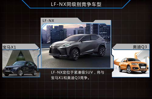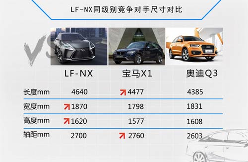 LF-NX與處于同一級別的寶馬X1和奧迪Q3將與新車尺寸大致相同,新車車身尺寸為4640mm/1870mm/1620mm,軸距為2700mm。新車外觀上極具動感的造型和雷克薩斯精湛的制作工藝,將是LF-NX的競爭力所在。
