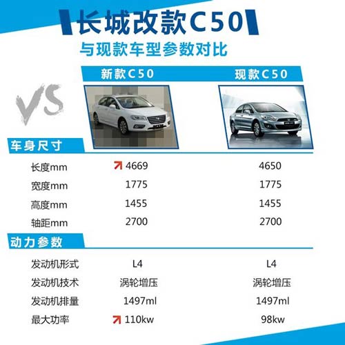 距離長城推出現款C50已經有2個年頭了,此次將上市的改款C50在外觀設計上更加年輕的同時,動力系統也進行了升級。新車將搭載型號為GW4G15B的1.5T渦輪增壓引擎,最大功率110kw,已超出現款車型所使用的1.5T增壓發動機12kw,傳動方面新車將匹配一臺5速手動變速器。長城改款C50在車身尺寸上也有所調整,新車的車身長度較現款車型增加了19mm,達到了4669mm,寬度、高度以及軸距均保持不變。其上市后,將與榮威550和比亞迪速銳等車型競爭。